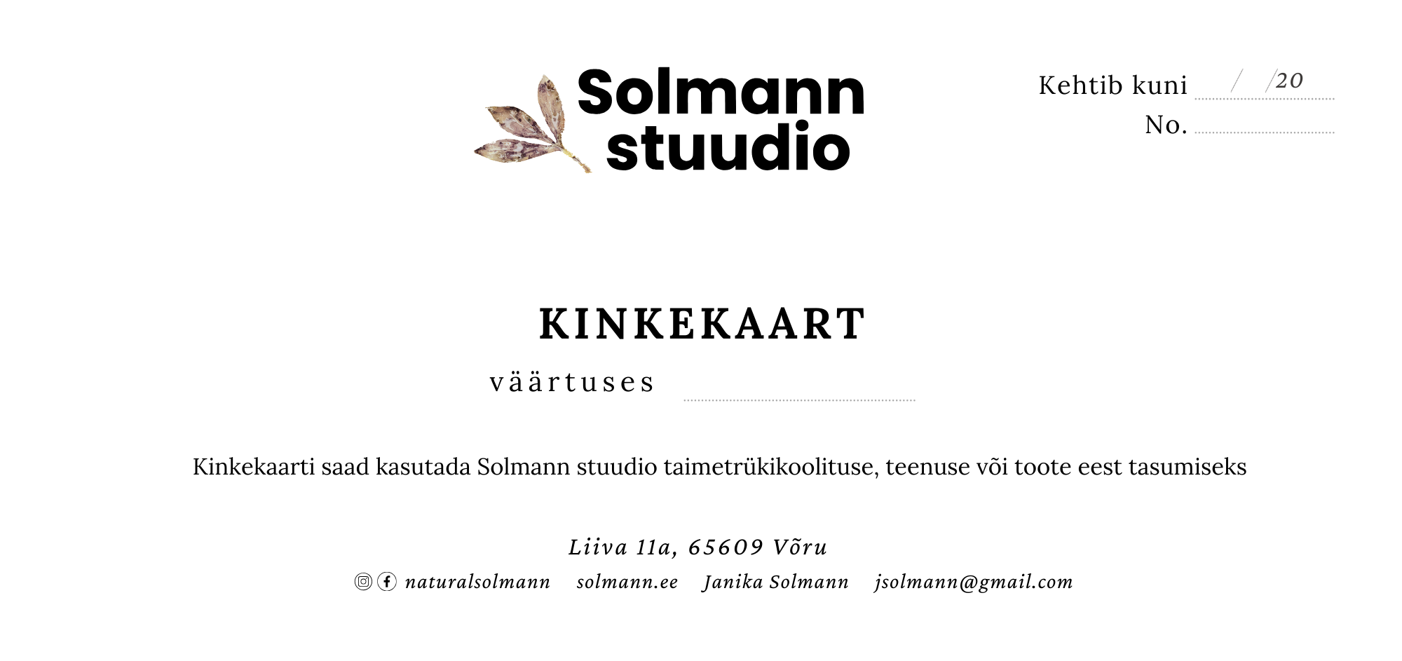 Ei tea täpselt, mida kinkida? Solmann Stuudio kinkekaart on ideaalne võimalus kinkida lähedasele vabadus valida just see, mis talle kõige rohkem rõõmu pakub – olgu selleks osalemine taimetrükitöötoas või mõni kaunis ja praktiline toode e-poest.